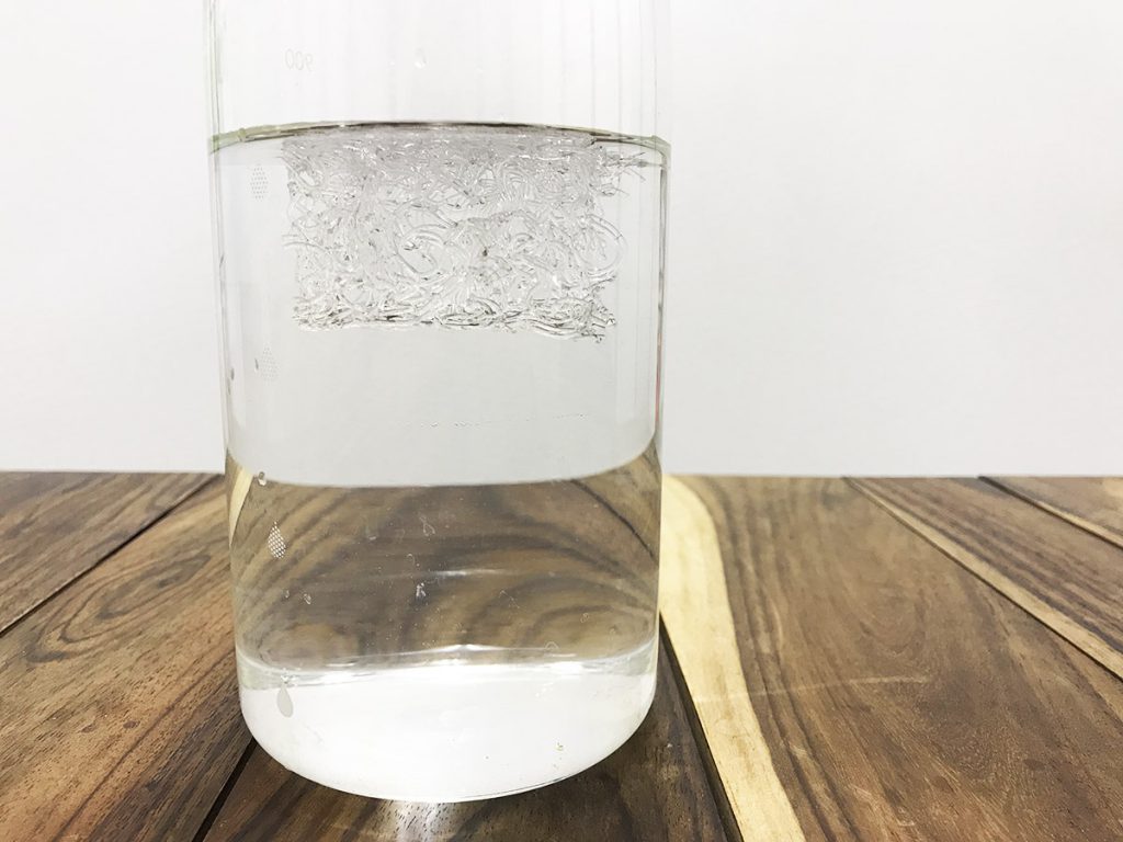 しかしポチャンと水に入れてみて、その予想は裏切られました。ファイバータングルドは一度も容器の底につくことなく、プカプカと浮いたままだったのです。つっついても押し込んでも沈む気配はありません。