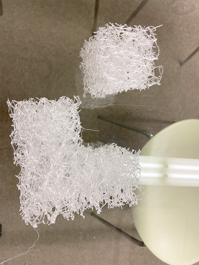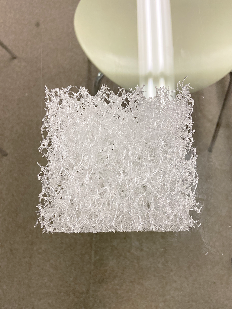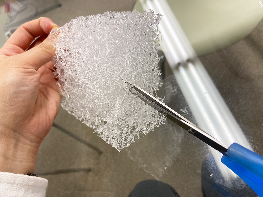 ファイバータングルドの繊維は、切ろうとすればはさみで簡単に切ることができますが、手でちぎるのは難しいくらいの強度があります。