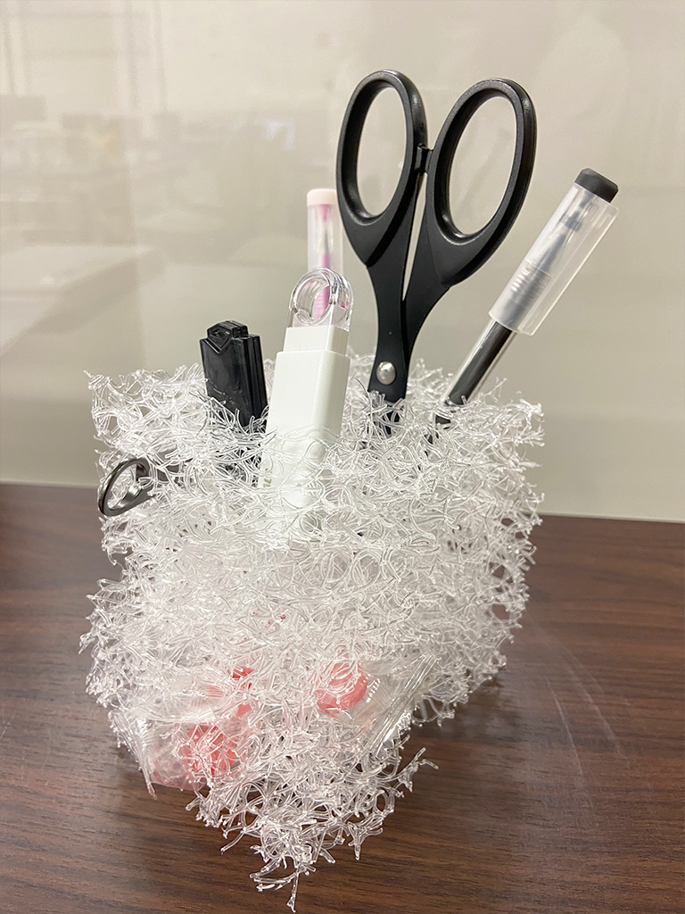 ちらばっていたUSBメモリやアメをファイバータングルドの繊維の中に詰め込んで、それを積み重ねて収納することができるようになりました。