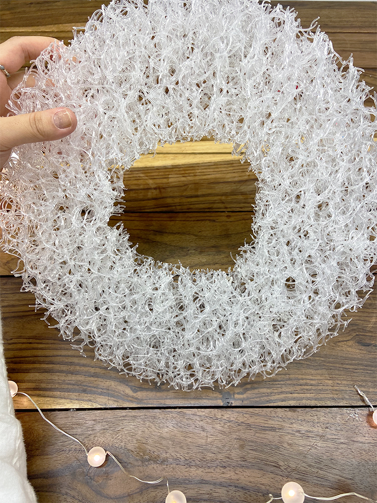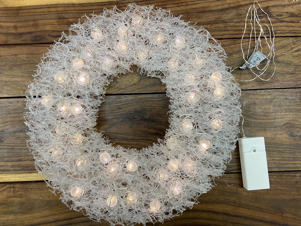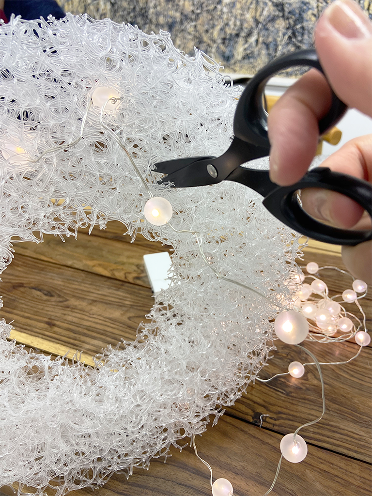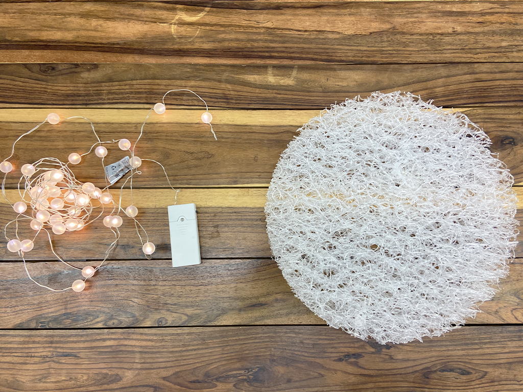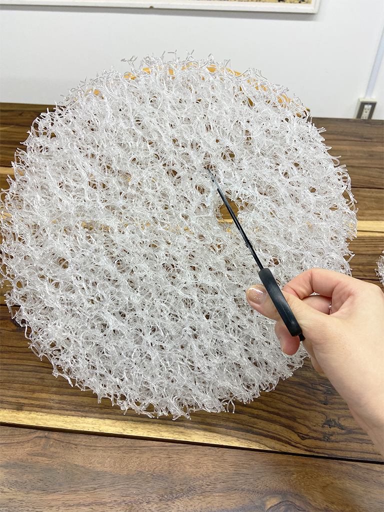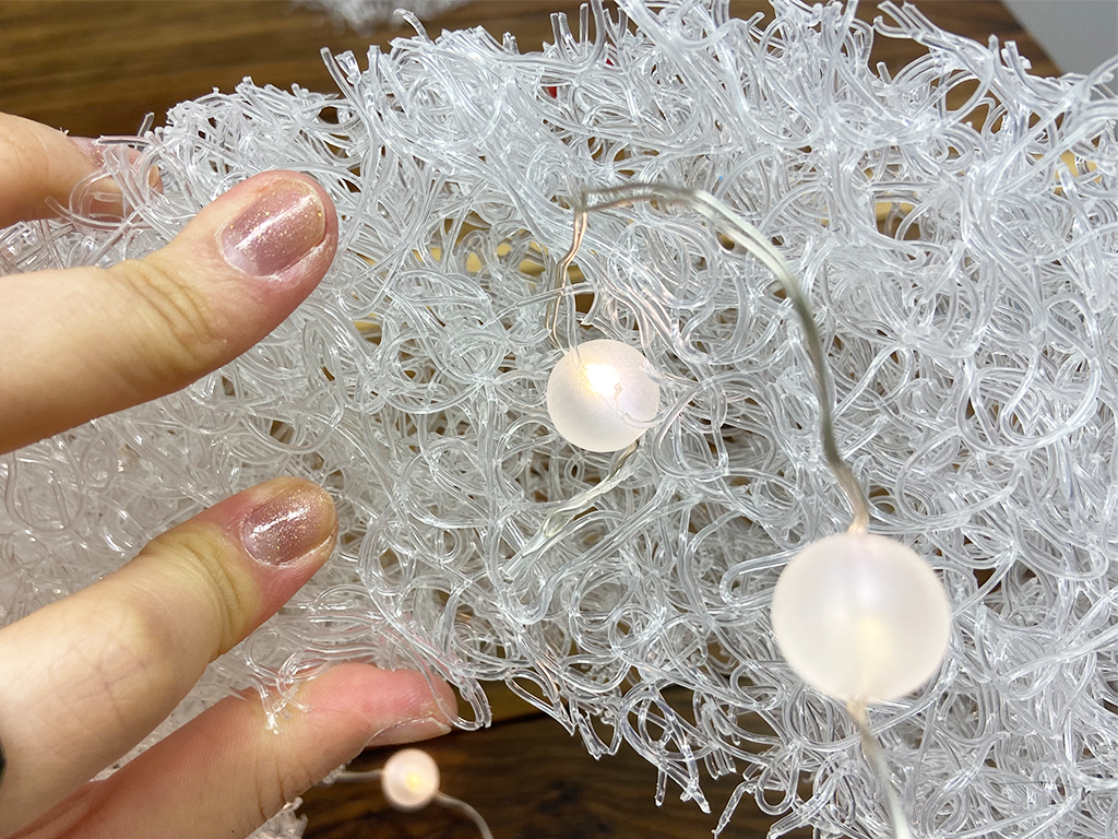 きれいな丸型に切り出せたら、ワイヤーのLEDライトを繊維のすきまに縫うようにくぐらせていきます。